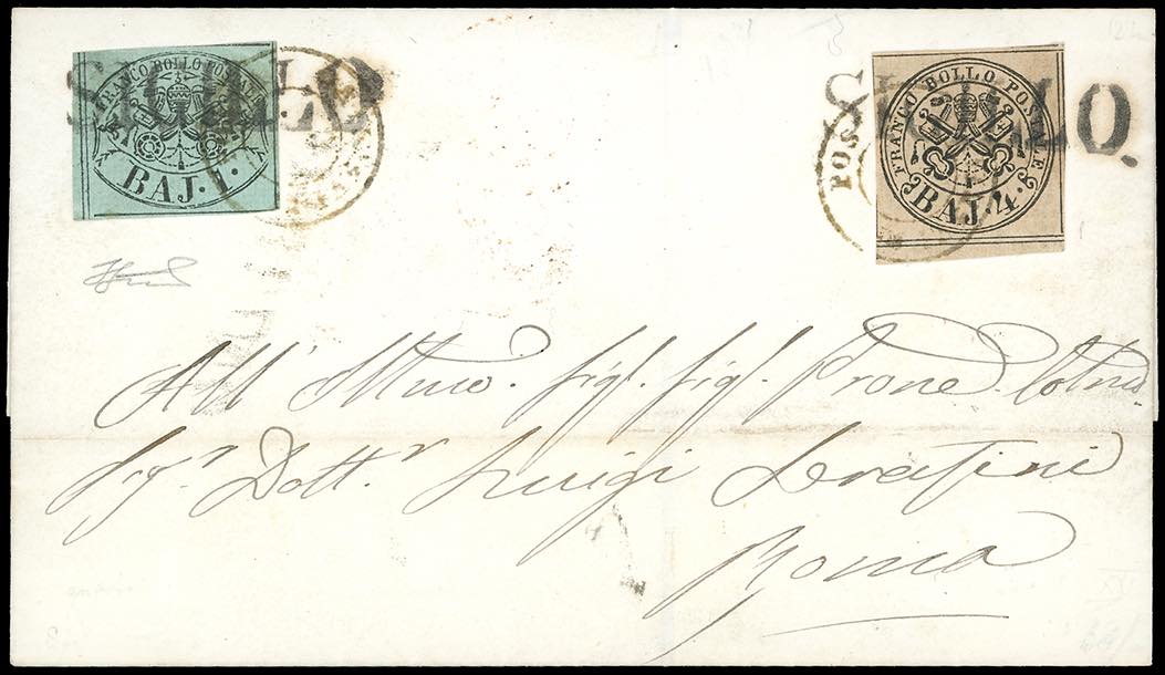 FABRIANO, 2C s.d. + SD di Sigillo non catalogato - 1 baj e 4 baj (2,5), perfetti e ben marginati, su fresca lettera per Roma, al verso ... Leggi tutto