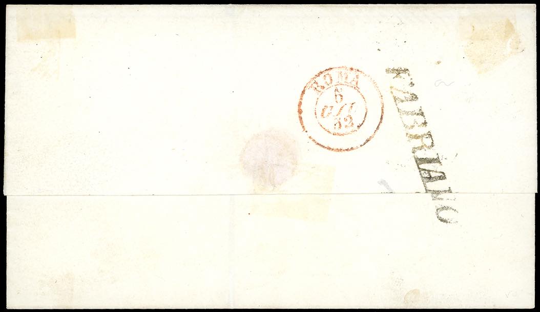 FABRIANO, 2C s.d. + SD di Sigillo non catalogato - 1 baj e 4 baj (2,5), perfetti e ben marginati, su fresca lettera per Roma, al verso bollo di arrivo del 5/6/1852 e SI brunastro di Fabriano. Combinazione di coannullatori inedita, di ottima qualità. Ferrario.