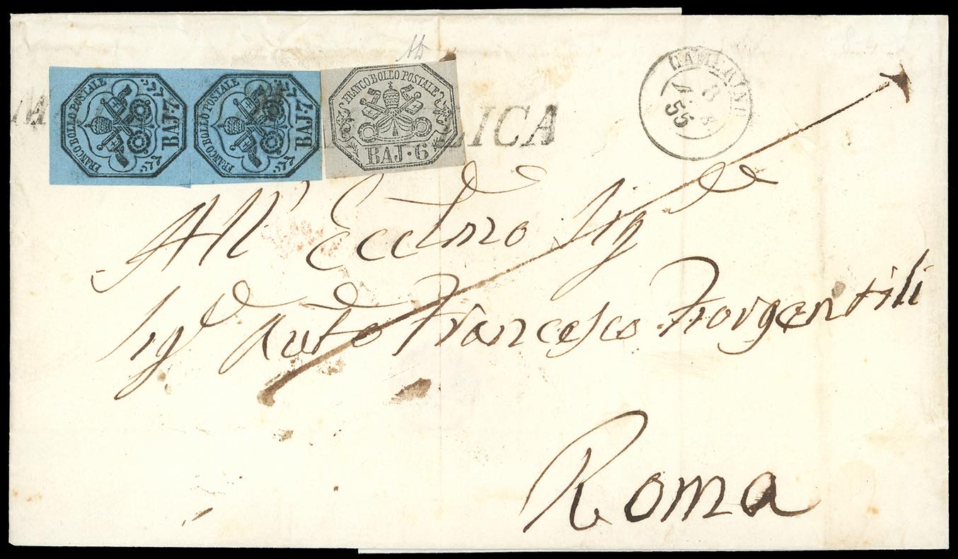 MATELICA, SI punti 6 - 7 baj, stampa con inchiostro nero oleoso, coppia verticale, 6 baj grigio, leggermente intaccato in alto (7a,8), su lettera di quattro porti per Roma, sul fronte transito di Camerino 8/4/1855. Pregevole affrancatura, specie da un ufficio secondario. A.Diena.