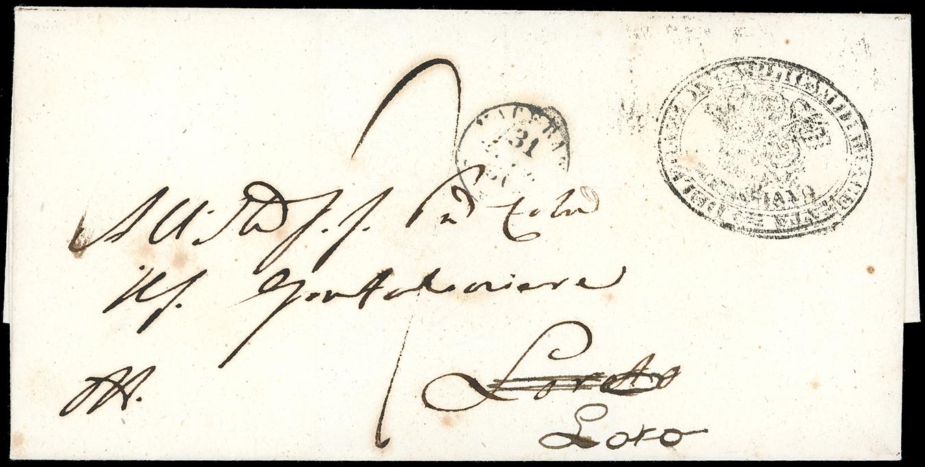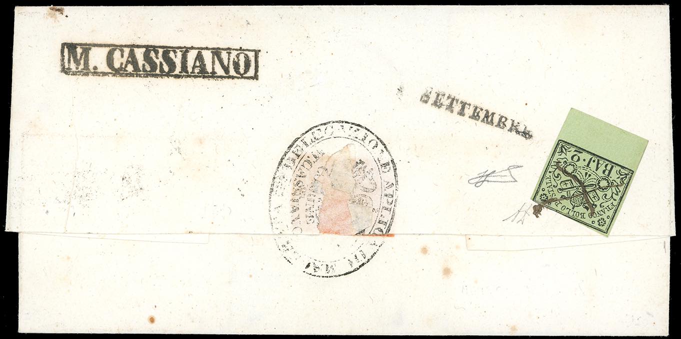 MONTE CASSIANO, a penna non catalogato - 2 baj (3), bordo di foglio in basso, leggermente intaccato in alto, al verso di fresca lettera in porto assegnato per Loreto, rispedita a Loro, sul fronte transito di Macerata 31/8/1854. Annullo inedito, probabilmente unico. A.Diena, Ferrario.