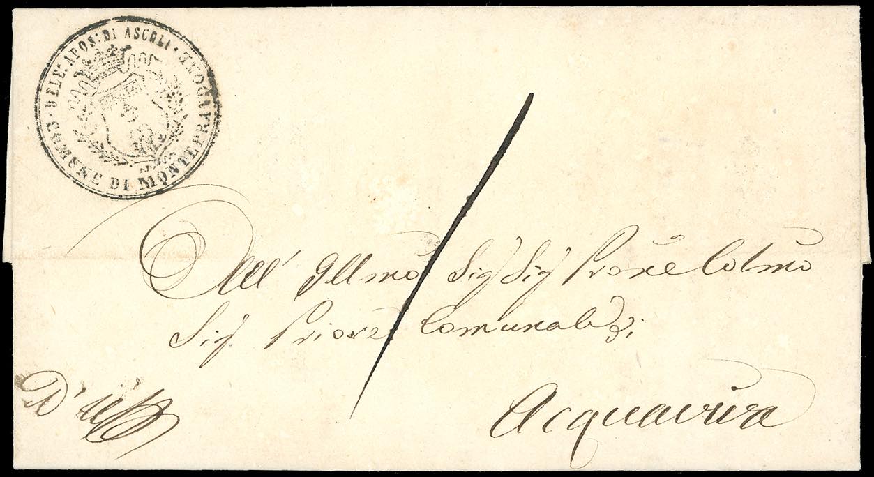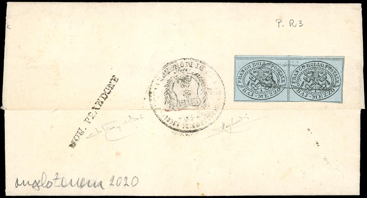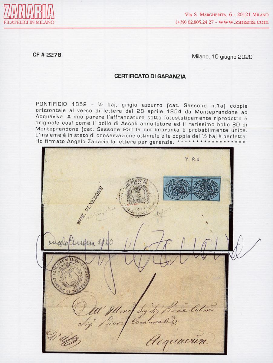 MONTEPRANDONE, Cart. punti R3 - 1/2 baj grigio azzurro (1a), coppia orizzontale, perfetta e ben marginata, al verso di lettera in porto assegnato del 28/4/1854 per Acquaviva, francobolli annullati con l'ovale in cartella di Ascoli e tassa 1 sul fronte. Si tratta dell'UNICA IMPRONTA NOTA DI QUESTO BOLLO POSTALE, di eccezionale qualità. Grande rarità degli annullamenti dello Stato Pontificio. Raybaudi, cert. Zanaria.