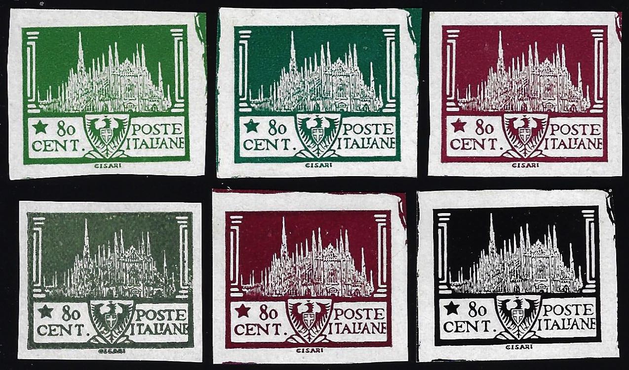 1919 - Sei prove di stampa per la serie "Artistica" disegnate da Cisari con soggetto il Duomo di Milano, tutte con valore da 80 cent., in colori differenti. Non comuni. Ferrario.