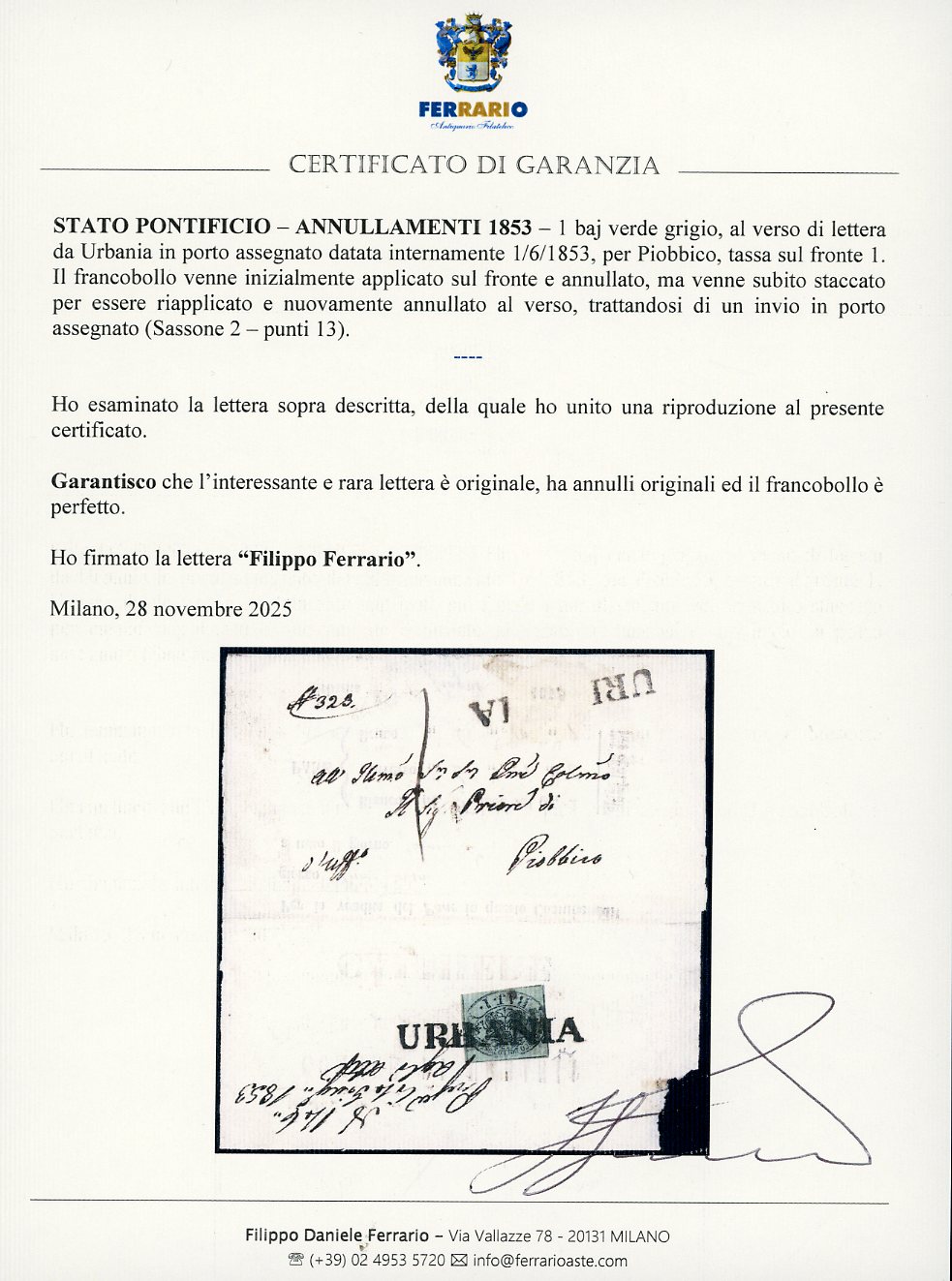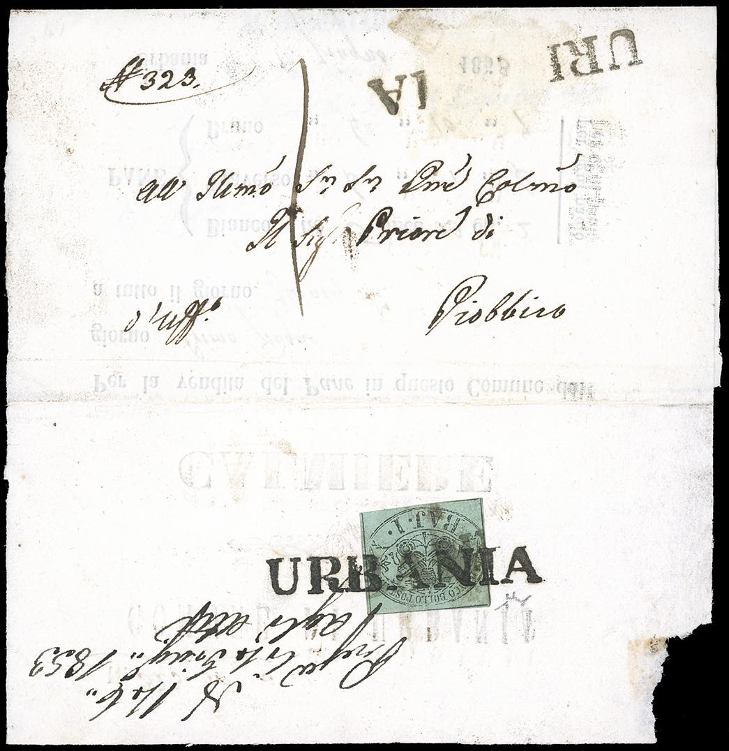 URBANIA, SD punti 13 - 1 baj (2), perfetto, al verso di lettera in porto assegnato datata internamente 1/6/1853 per Piobbico, tassa sul fronte 1. Il francobollo venne inizialmente applicato sul fronte e annullato, ma venne subito staccato per essere riapplicato e nuovamente annullato al verso, trattandosi di un invio in porto assegnato. Rara e molto interessante. Cert. Chiavarello e Ferrario.