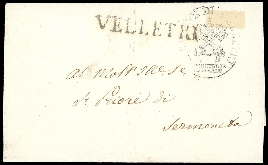 VELLETRI, SD + penna non catalogato -1/2 baj grigio azzurro (1a), coppia orizzontale con interspazio di gruppo al centro, perfetta, al verso di lettera in porto assegnato per Sermoneta. Combinazione di annulli inedita. Cert. Ferrario.