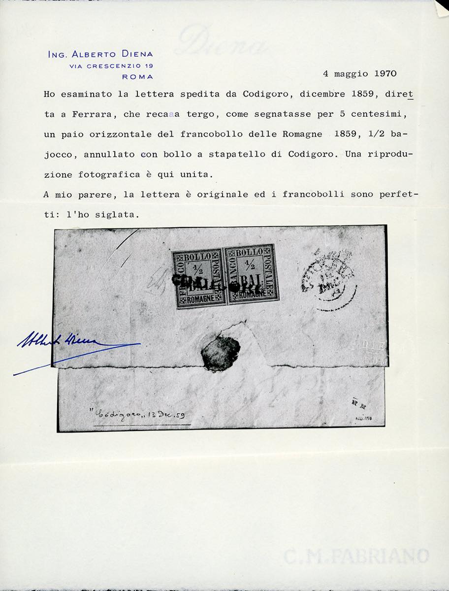 1859 - 1/2 baj giallo paglia (1), coppia, perfetta, al verso di lettera in porto assegnato da Codigoro 13/12/1859 a Ferrara, tassata 5 cent. Bella! Emilio Diena, cert. A. ed E.Diena.