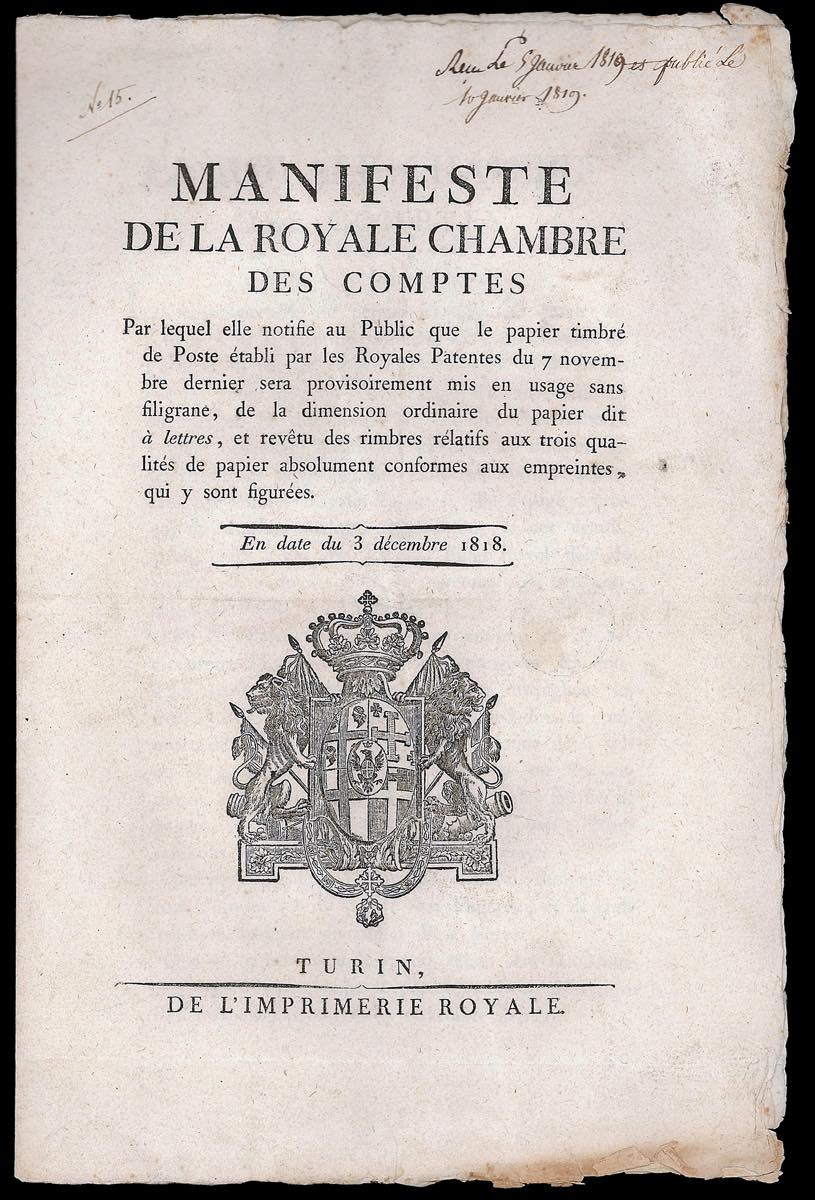 1818 - Manifesto camerale del 3/12/1818 in lingua francese, con le impronte dei tre Cavallini a stampa. Molto raro. Giulio Bolaffi per esteso.