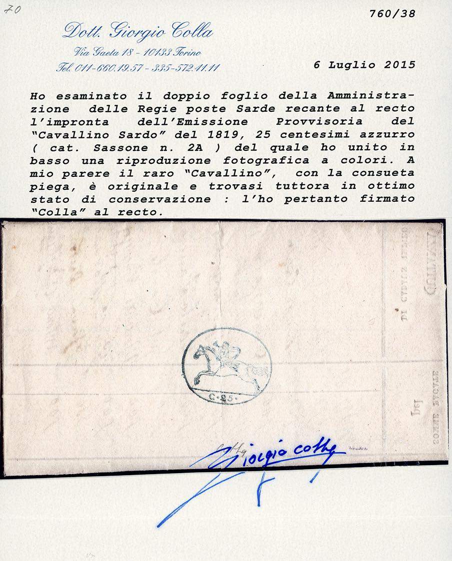 1819 - 25 cent. Cavallino, impressione a stampa, doppio foglio con stampa tipografica dell'Amministrazione delle Poste Regie, compilato internamente a penna (2A), nuovo, consueta lieve piega sull'impronta, ottimo stato. Cert. Colla.