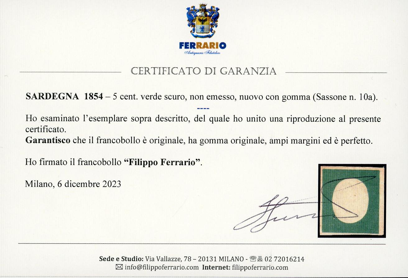 1854 - 5 cent. verde scuro, non emesso (10a), gomma originale, perfetto. Molto fresco, ampi margini. Chiavarello, Emilio Diena, cert. Ferrario.