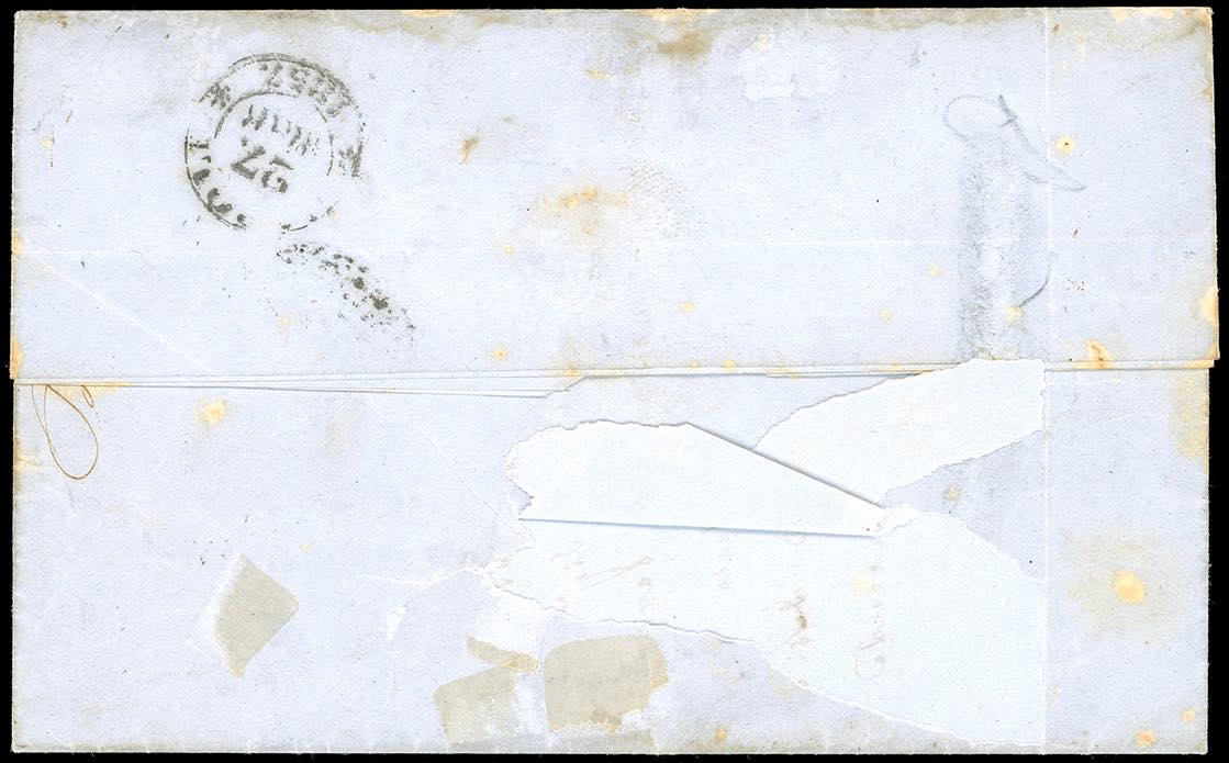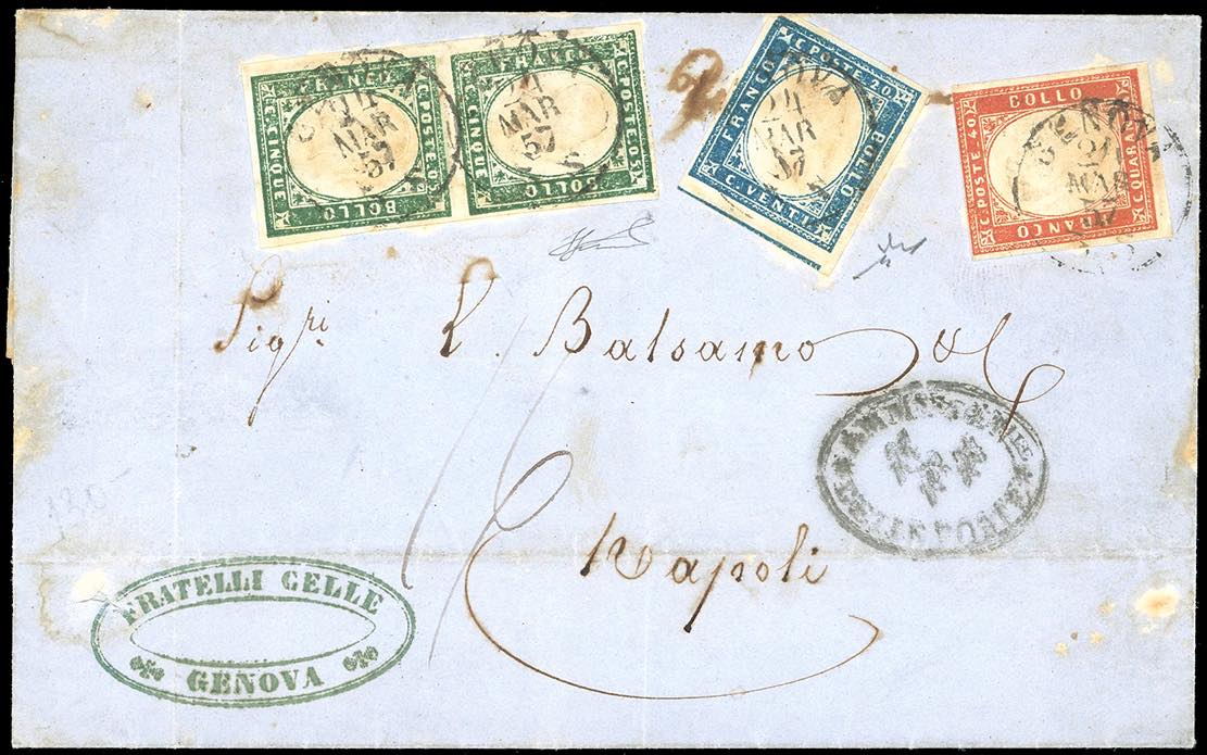 1857 - 5 cent. verde mirto chiaro, coppia, 20 cent. cobalto scuro, 40 cent. vermiglio (13Aa,15b,16a), perfetti, su lettera da Genova 24/3/1857 a Napoli, tassata 16 grana. Non comune tricolore. Chiavarello, cert. Ferrario. Ex coll. Imperato.