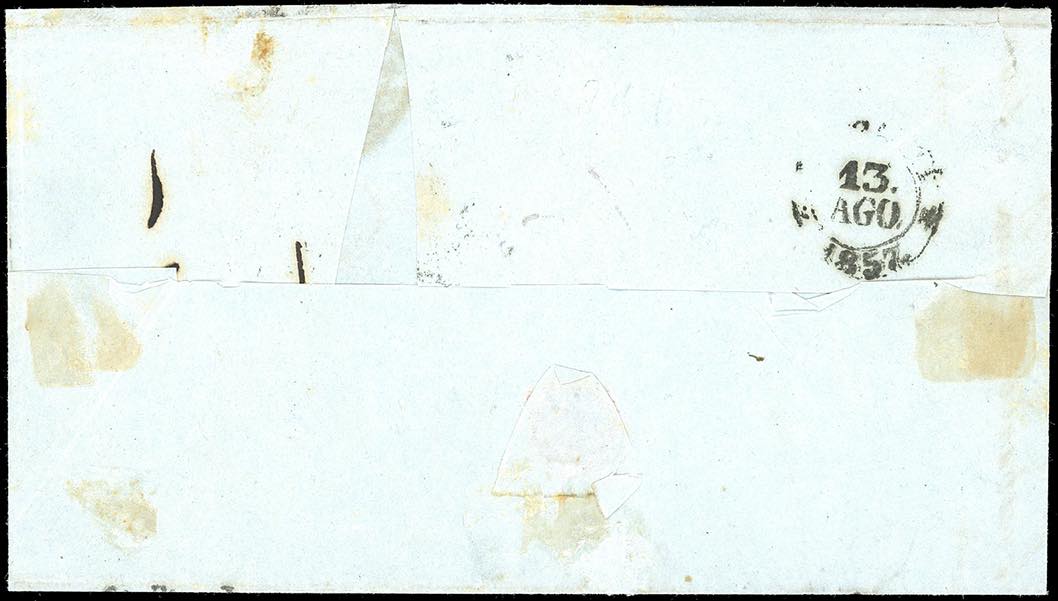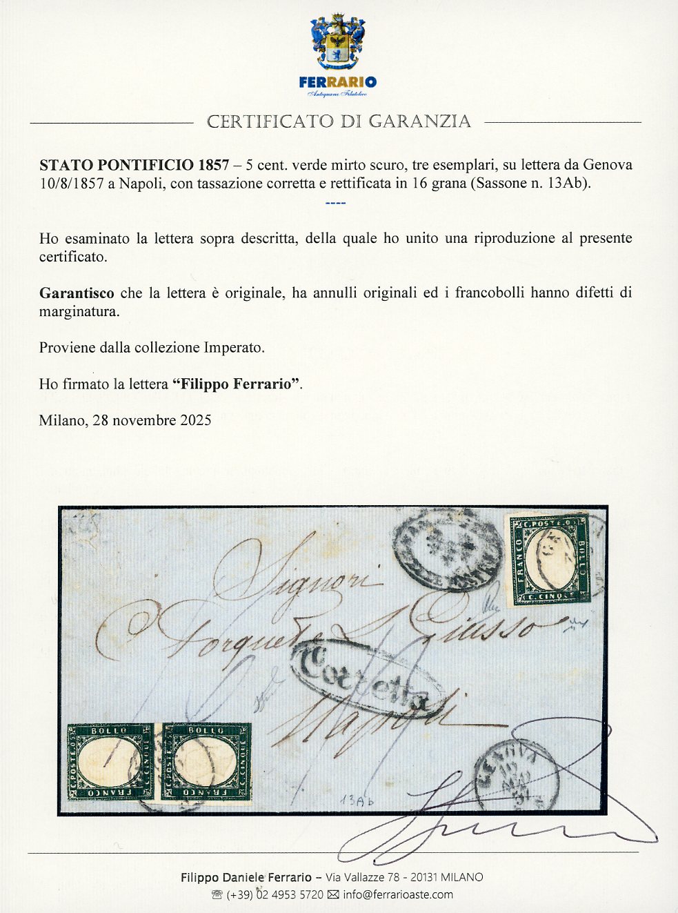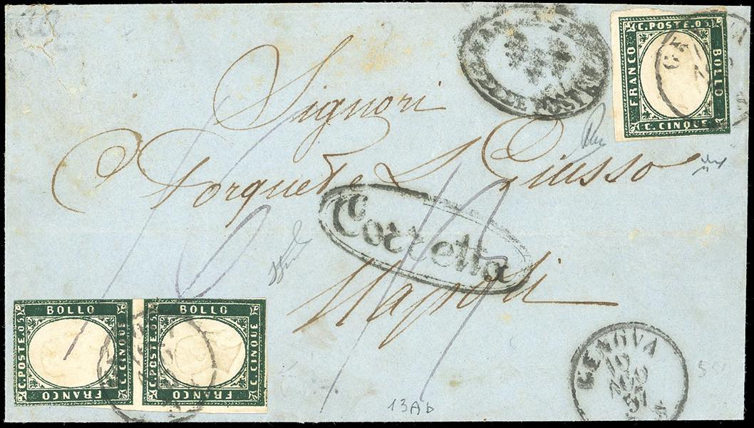 1857 - 5 cent. verde mirto scuro (13Ab), tre esemplari con lievi difetti di marginatura, su lettera da Genova 10/8/1857 a Napoli, con tassazione corretta e rettificata in 16 grana. Insieme non comune. Cert. Ferrario. Ex coll. Imperato.