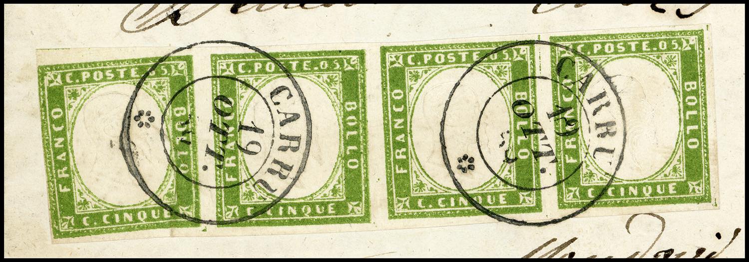 1859 - 5 cent. verde oliva (13Bc), striscia orizzontale di quattro, ottimo stato, su sovracoperta di lettera da Carrù 19/10/1859 (punti 6) ... Leggi tutto