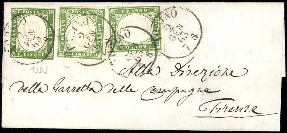 1863 - 5 cent. verde bronzo (13Db), in affrancatura gemellare con due esemplari del 5 cent., tinte differenti del 1862, lievi difetti di marginatura, su sovracoperta di lettera da Torino 2/1/1863 a Firenze. Bella affrancatura di valori gemelli.