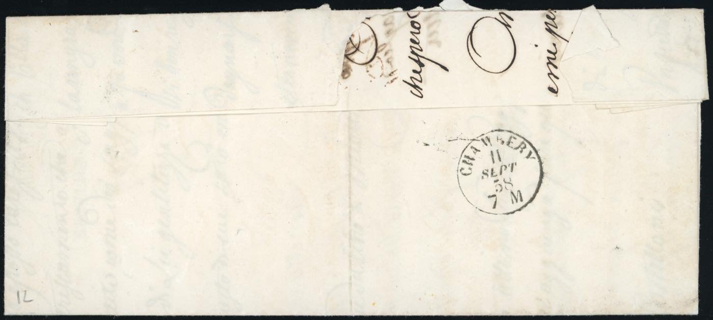 1858 - 10 cent. terra d'ombra giallognolo (14b), coppia, perfetta, su lettera da Torino 10/9/1858 a Chambery, indirizzata ad un militare. ... Leggi tutto