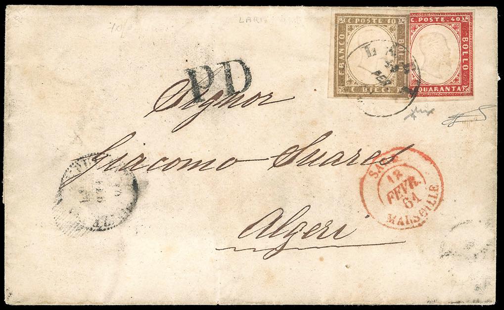 1861 - 10 cent. bruno tenue e 40 cent. rosso carminio (14Ch,16D), perfetti, su lettera da Lari 10/2/1861 ad Algeri, in Algeria, bollo di ... Leggi tutto