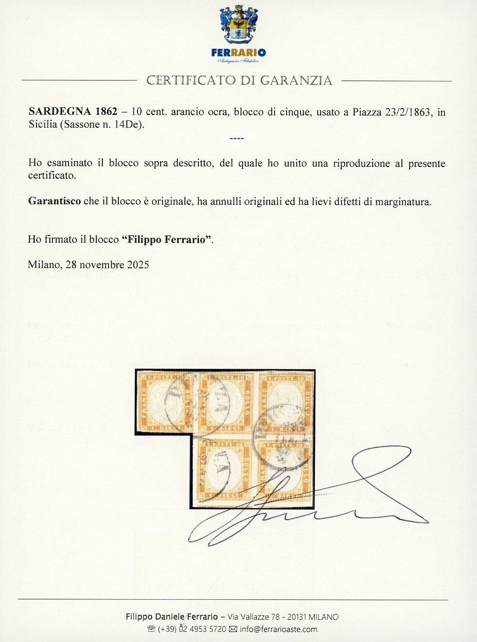 1862 - 10 cent. arancio ocra (14De), blocco di cinque, alcuni lievi difetti di marginatura, usato a Piazza 23/2/1863, ottimo aspetto. Raro. Em. e A.Diena, Chiavarello, cert. Ferrario.