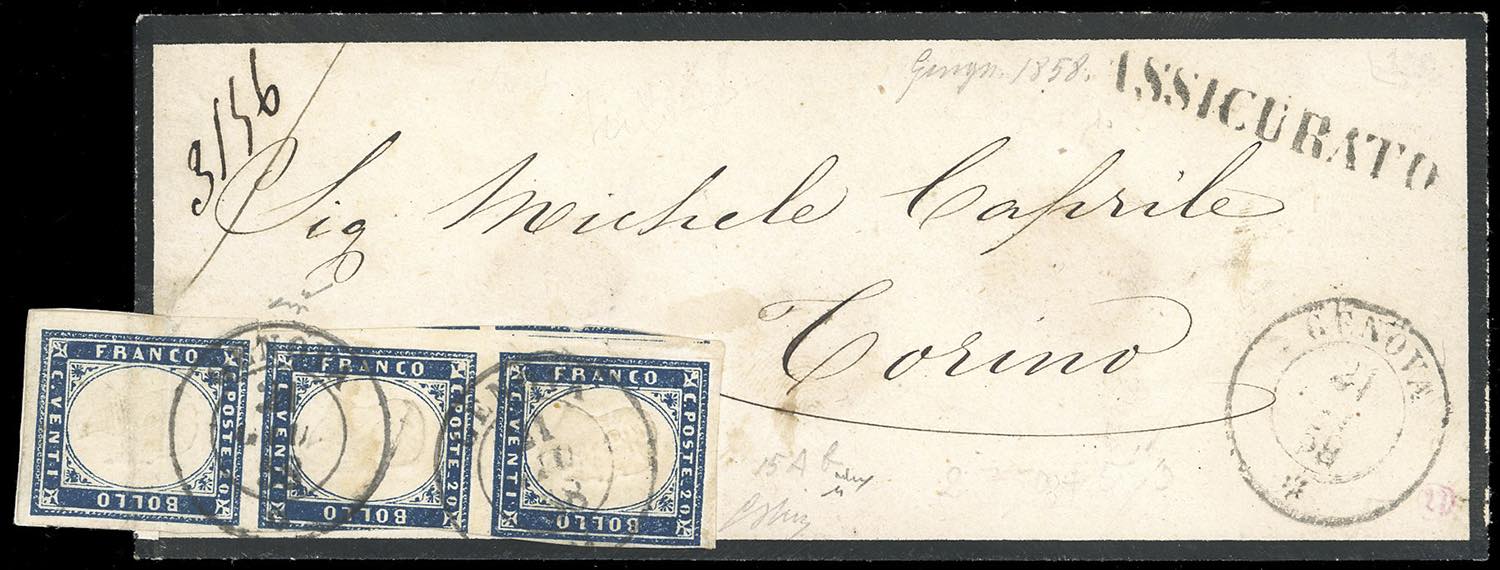 1858 - 20 cent. azzurro oltremare scuro (15Aa), striscia orizzontale di tre, difetti, su bustina assicurata da Genova 21/6/1858 a Torino. ... Leggi tutto