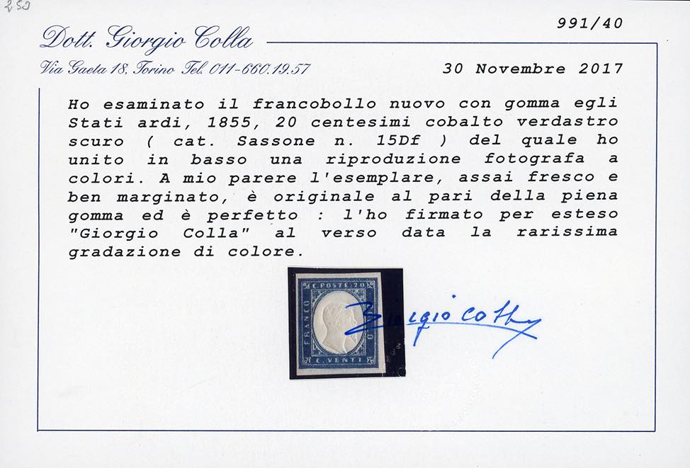 1861 - 20 cent. cobalto verdastro scuro (15Df), nuovo, gomma originale, perfetto. Si tratta della tinta più rara del 20 cent. della IV emissione, ottima qualità. Per specialista. Emilio ed Alberto Diena, G.Bolaffi, cert. Giorgio Colla (per esteso).