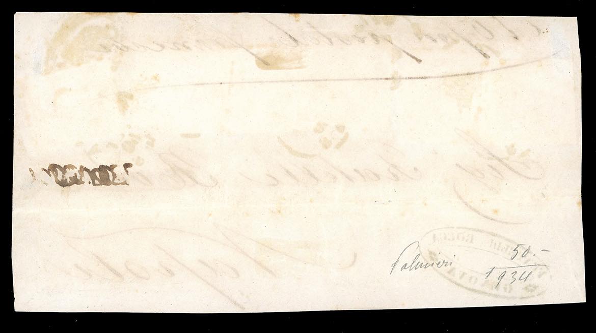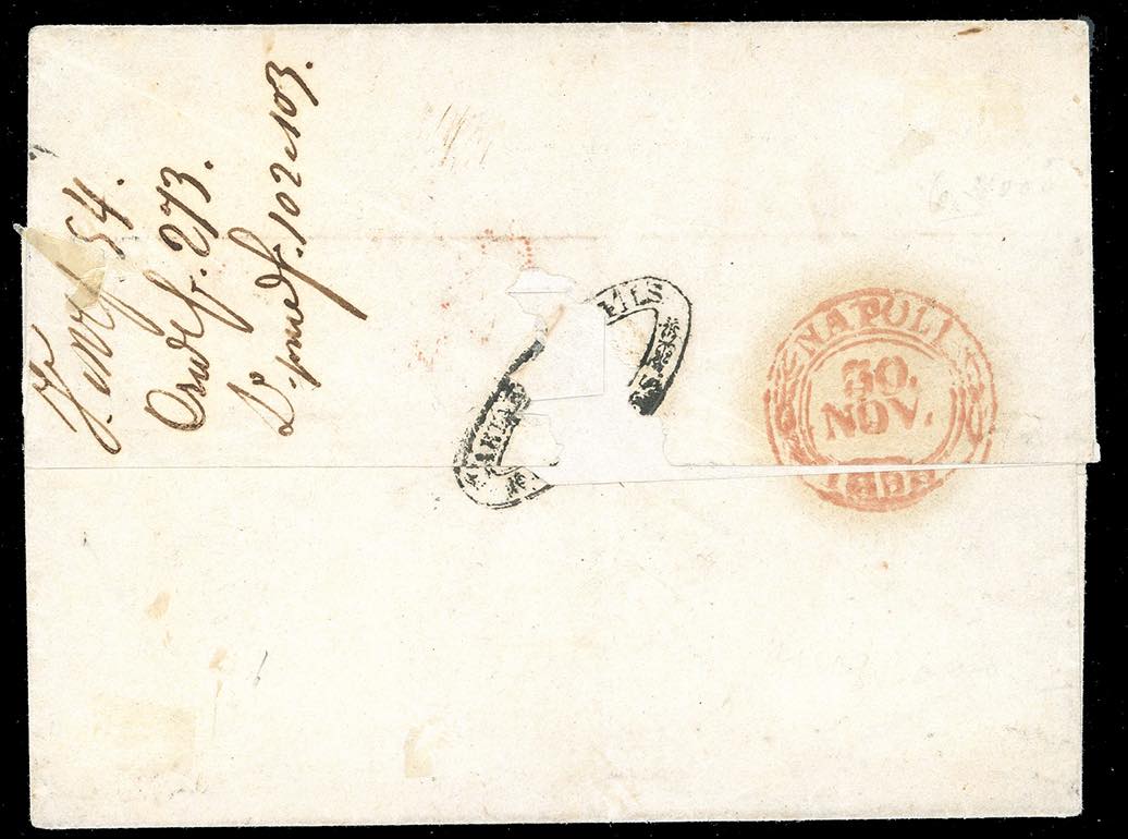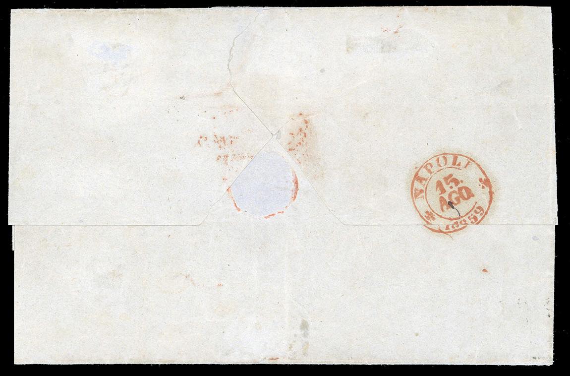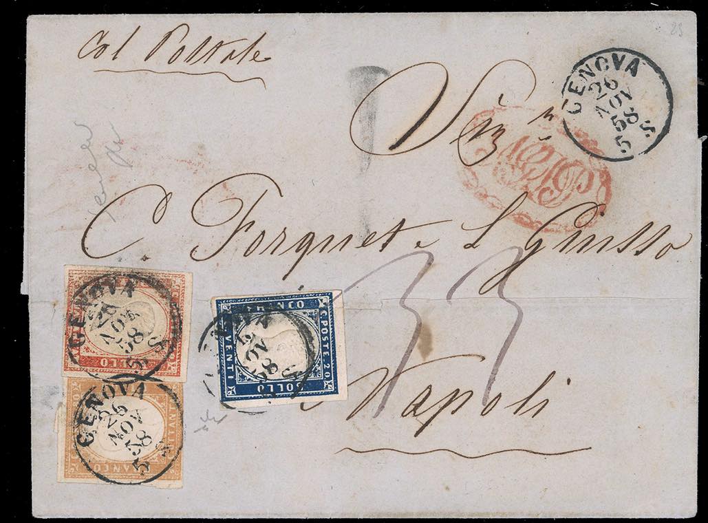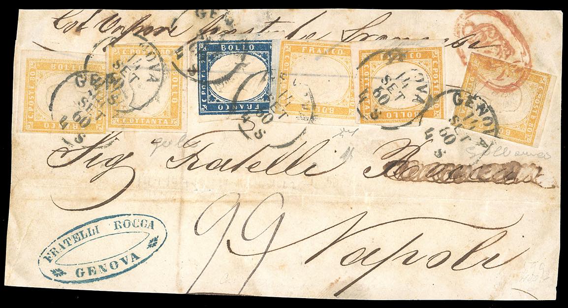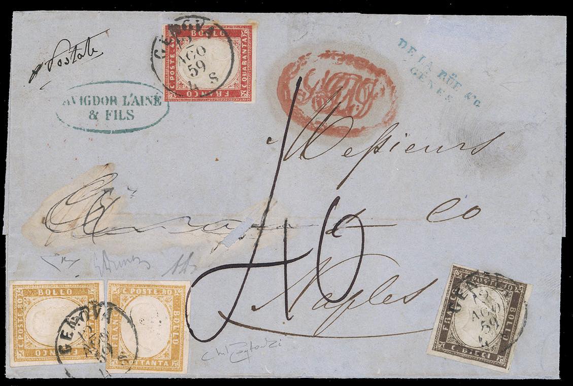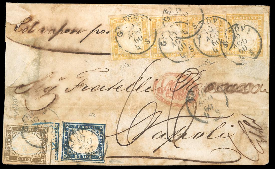 1858/60 - Eccezionale insieme di cinque corrispondenze per Napoli con i vapori postali. - 20 cent., 40 cent. e 80 cent. (15Ab,16Ab,17b), su lettera da Genova 26/11/1858, tassata 33 grana; - 10 cent., 40 cent. e 80 cent., due esemplari (14A,16c,17A) su lettera da Genova 12/8/1859, tassata 40 grana; - 40 cent. e 80 cent., tre esemplari (16Aa,17A), su lettera, parzialmente incompleta al verso, da Torino 12/11/1859, tassata 49 grana, al verso bolli di transito e di arrivo; - 10 cent., 20 cent. e 80 cent., quattro esemplari (14Ad,15C,17B), su frontespizio di lettera da Genova 10/8/1860, tassata 66 grana; - 20 cent. e 80 cent., cinque esemplari di tinte differenti (15C,17B), su frontespizio di lettera da Genova 10/8/1860, tassata 66 grana; - 20 cent. e 80 cent., cinque esemplari di tinte differenti (15C,17B), su frontespizio di lettera da Genova 14/9/1860, tassata 99 grana. Si tratta della massima affrancatura nota tra il Regno di Sardegna e quello delle Due Sicilie. Tutti i documenti sono firmati da importanti periti. Insieme unico ed irripetibile, proveniente dalle collezioni del Professor Saverio Imperato.
