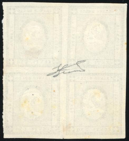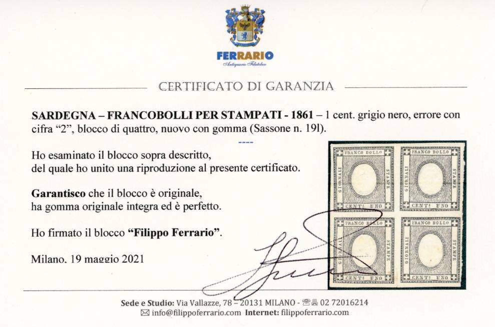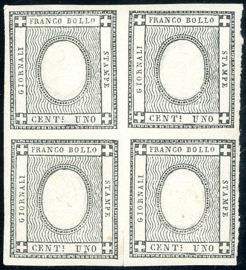 1861 - 1 cent. per stampati, errore di cifra "2" (19l), blocco di quattro, gomma originale integra, perfetto. Cert. Ferrario.
