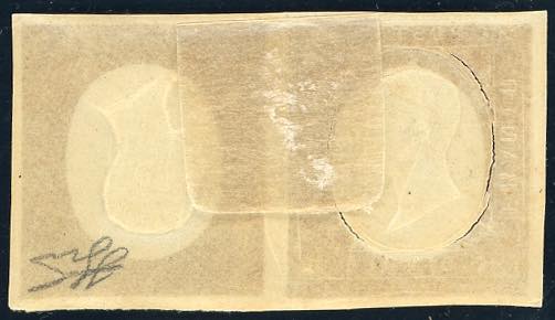 1854 - 5 cent. rosso mattone, prova con colori invertiti, coppia con un esemplare con in rilievo la sola effigie capovolta (10g/10ea), gomma originale, consueta fessurazione lungo l'ovale di un esemplare. Rarissima!