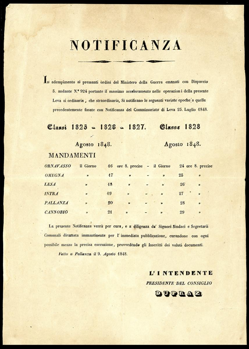 1848 - Notifica datata Pallanza 9/8/1848 a firma dell'Intendente Dupraz relativa alla Leva. Interessante documento della prima guerra d'indipendenza.