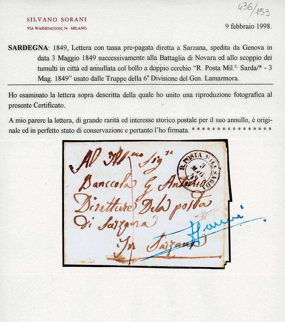 1849 - Lettera prefilatelica scritta a Genova 3/5/1849 per Sarzana, sul fronte datario a doppio cerchio R.Posta Militare Sarda 3/5/1849. Interessante lettera risalente al periodo della Rivolta di Genova, molto rara e di ottima qualità. Cert. Sorani. Ex coll. Balossini.