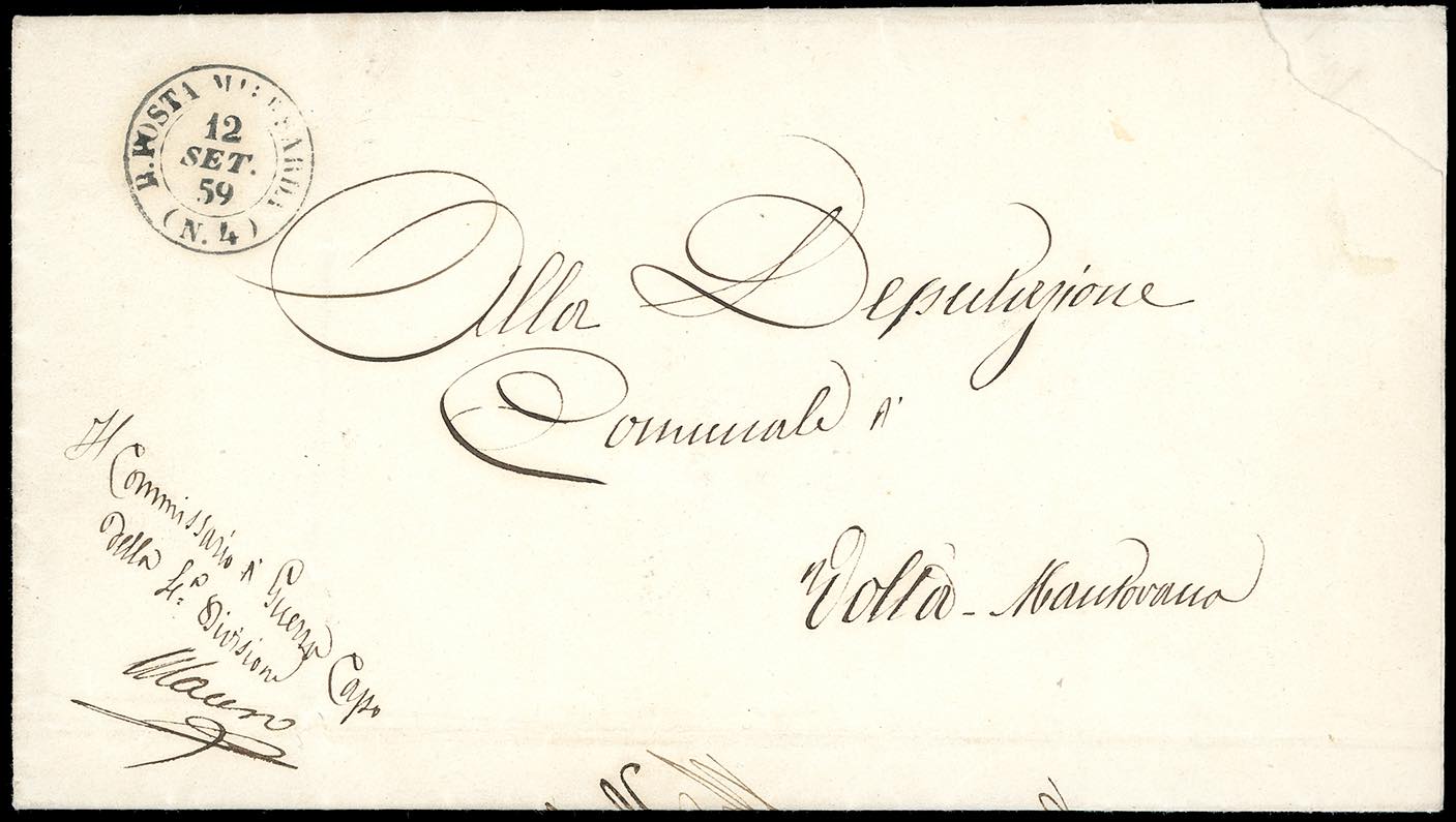 1859 - Lettera in franchigia dalla Posta Militare Sarda n. 4 12/9/1859 a Volta Mantovana. Molto fresca.