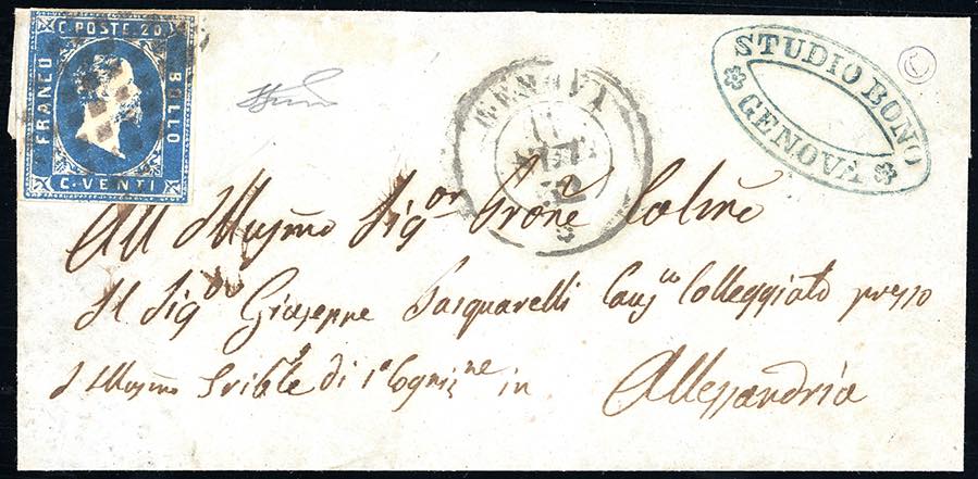 LIGURIA-GENOVA, rombi + d.c. rosetta punti 13 - 20 cent. (2), perfetto, su fresca lettera del 11/9/1852 per Alessandria. Ferrario.