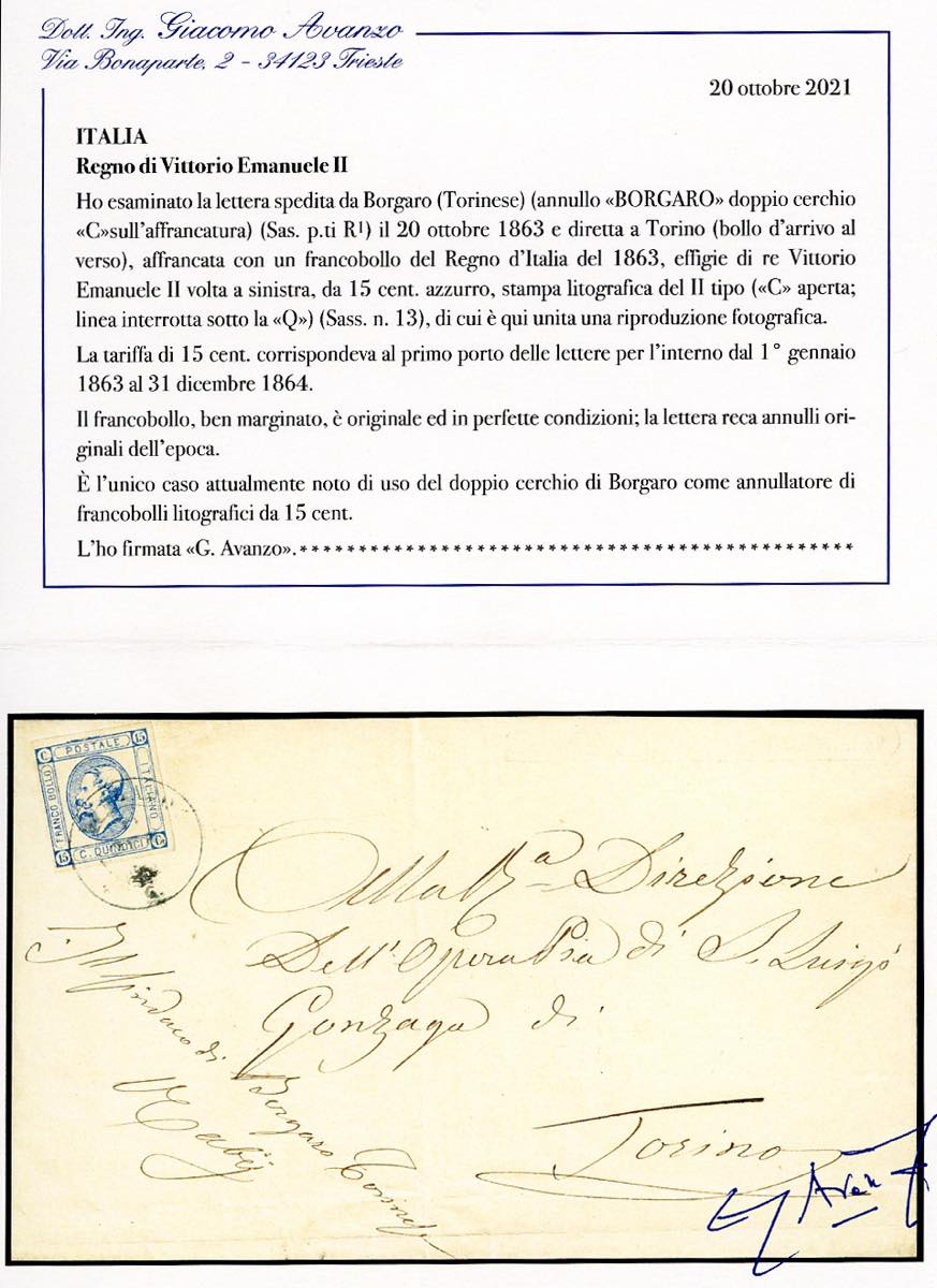 PIEMONTE-BORGARO, punti R1 - 15 cent. (13), perfetto, su sovracoperta di lettera del 20/10/1863 per Torino. UNICO CASO NOTO di questo raro annullo sul 15 cent. Litografico, ad oggi inedito e di prossima catalogazione. Ferrario, cert. Avanzo.