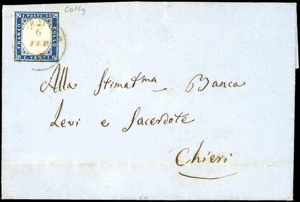 PIEMONTE-LOMBRIASCO, punti 13 - 20 cent. (15Aa), a filo in alto, su lettera del 6/2/1858 per Chieri. Raro annullo. Cert. Colla.