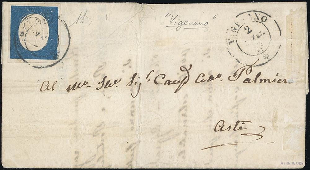 PIEMONTE-VIGEVANO, punti 9 - 20 cent. azzurro (8),ben marginato, su lettera da Vigevano 2/12/1854 ad Asti. A.Diena.