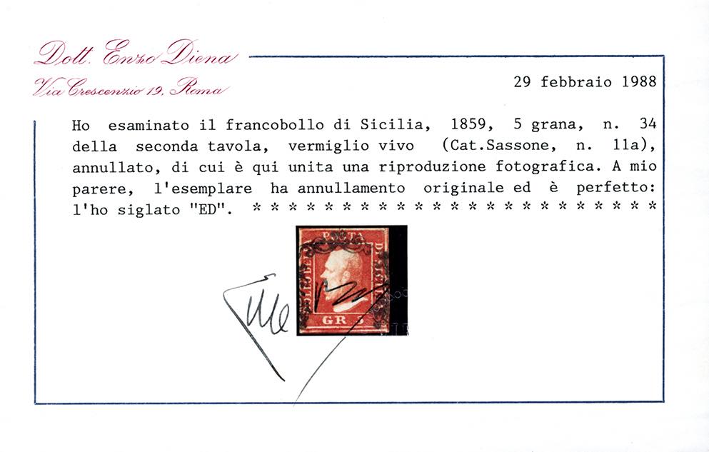 1859 - 5 grana vermiglio vivo, II tavola (11a), perfetto, usato con annullo a ferro di cavallo ben posizionato e che lascia scoperta l'effigie. Ferrario, cert. E.Diena.
