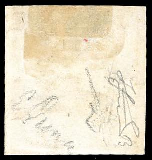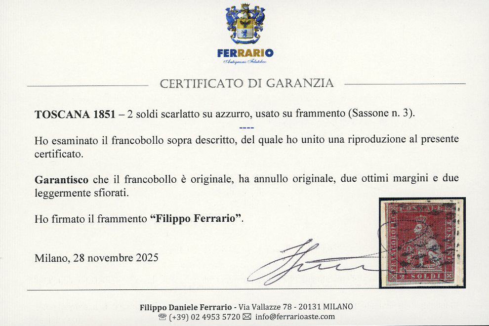 1851 - 2 soldi scarlatto su azzurro (3), due ottimi margini, due leggermente sfiorati, usato su frammento, con annullo leggero e non deturpante. Raro. Em.Diena, cert. Ferrario.