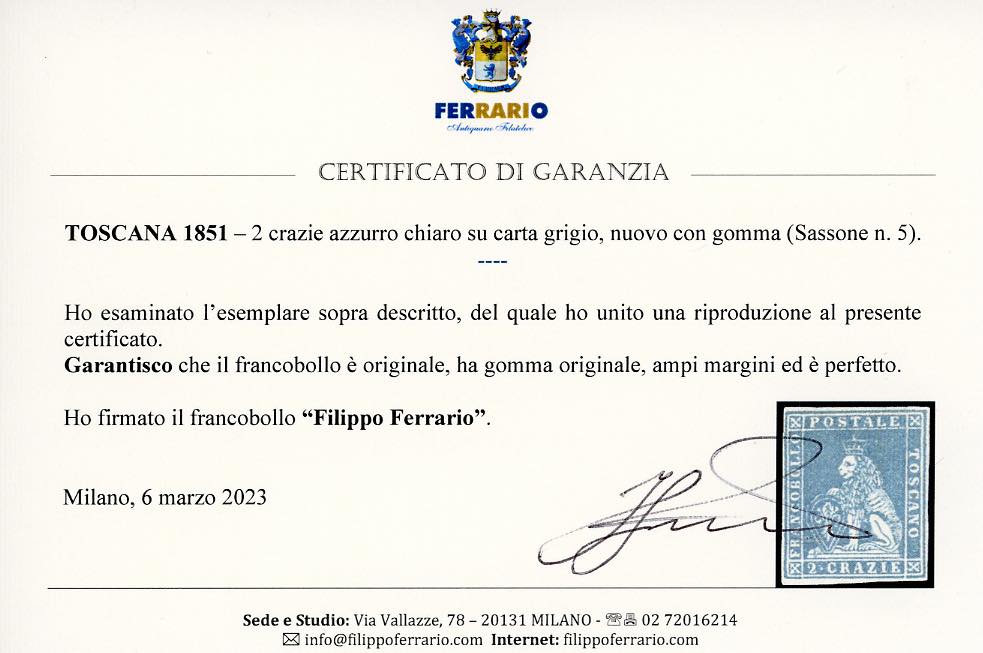 1851 - 2 crazie azzurro chiaro su carta grigia (5), nuovo, gomma originale, lieve traccia di linguella, perfetto, ampi margini. Raro di ... Leggi tutto