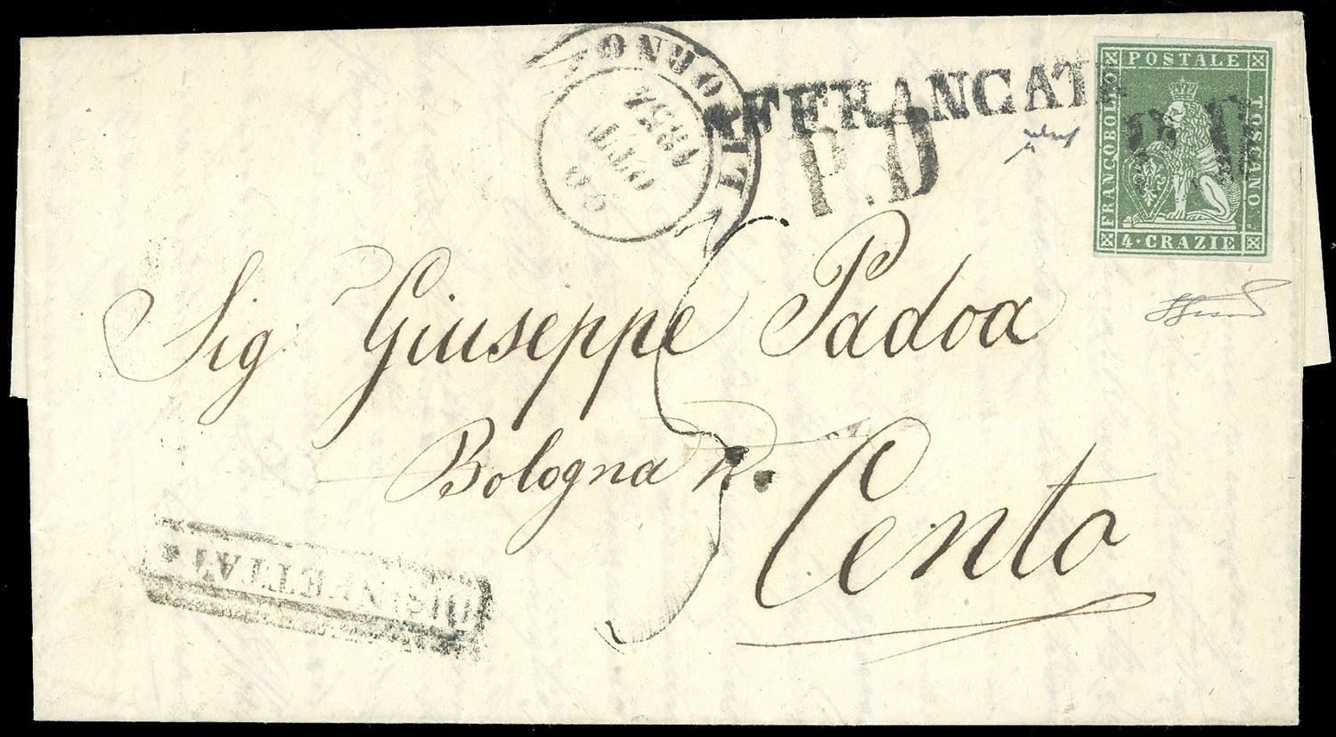 1854 - 4 crazie verde su grigio (6), tre ottimi margini, perfetto a sinistra, su fresca lettera da Livorno 20/10/1854 a Cento, bollo in cartella "disinfettati" e tagli di rasoio per l'epidemia di colera. Bellissima. Chiavarello, Ferrario.