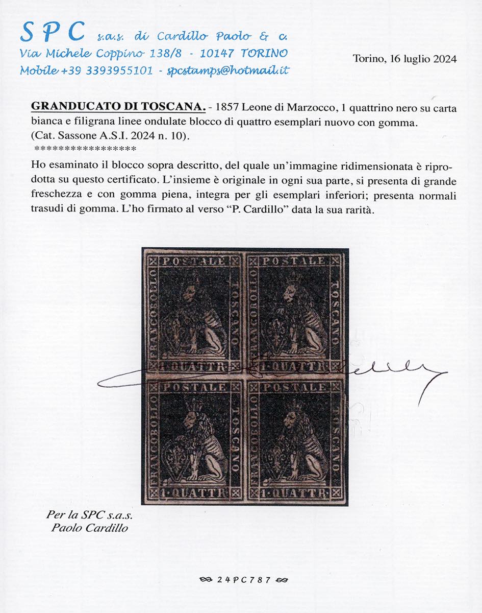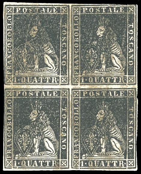 1857 - 1 quattrino nero, II emissione (10), blocco di quattro, nuovo, gomma originale, integra per gli esemplari inferiori, perfetto e ben ... Leggi tutto