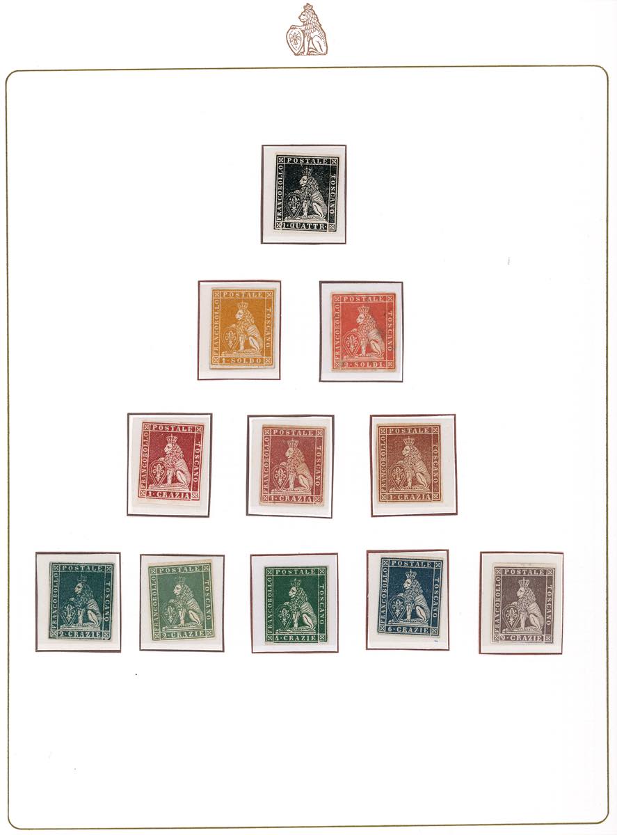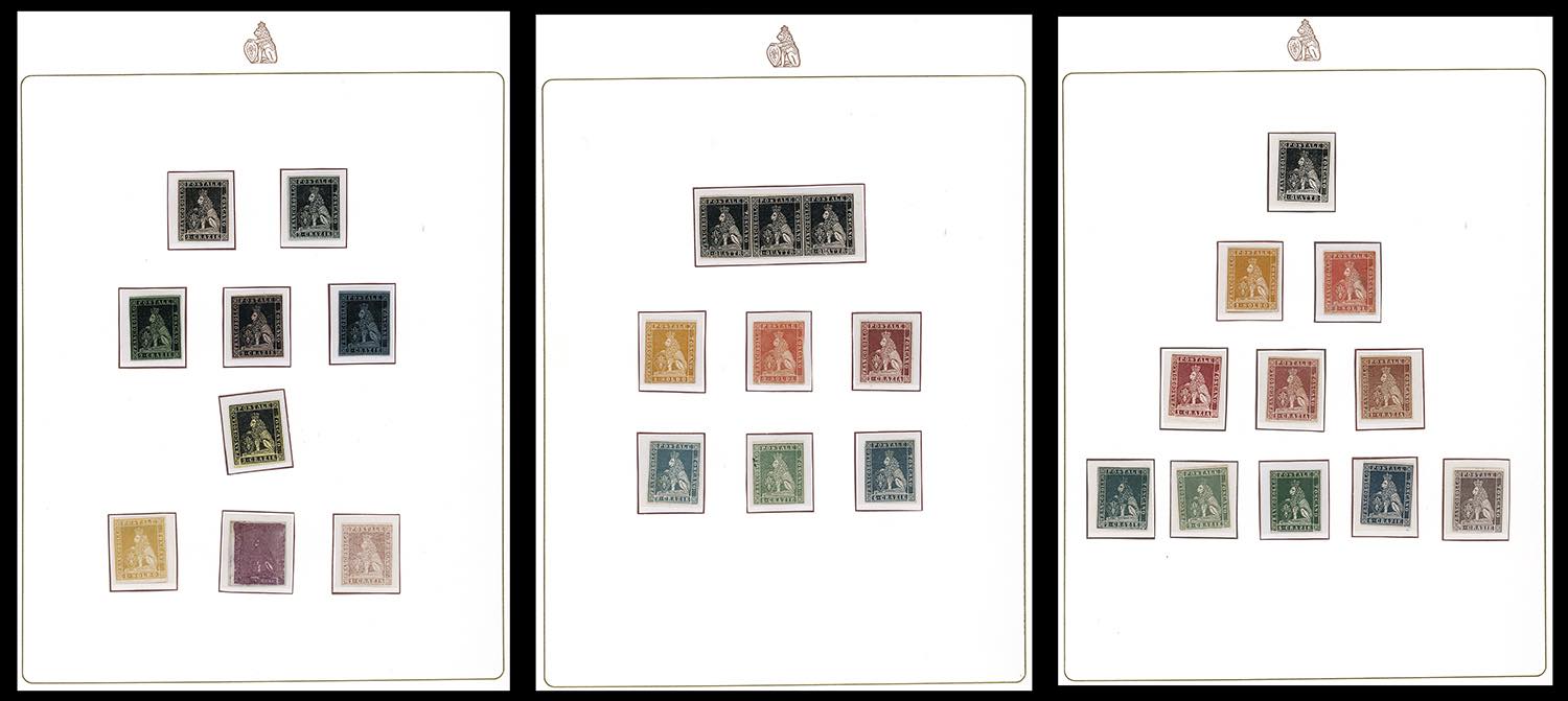 1851 - Tre fogli da esposizione con 29 prove di stampa, in parte stampate con inchiostro colorato su carta bianca, in parte con inchiostro nero su carta colorata, nuove, senza gomma come sempre, generalmente di buona qualità e firmate Raybaudi. Raro insieme di difficile reperibilità, per specialista. Ex coll. Imperato.