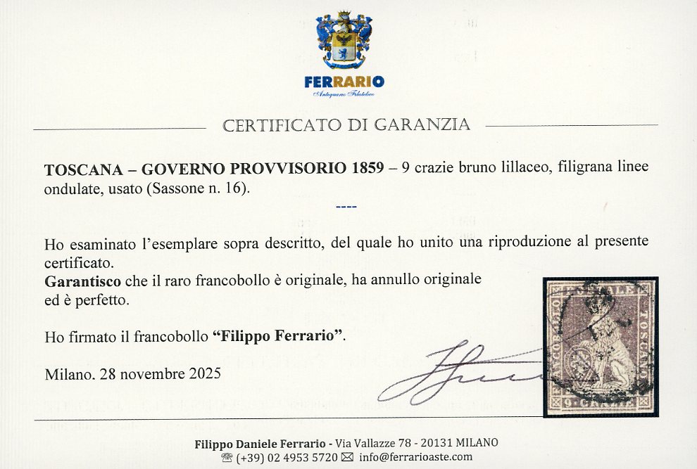 1859 - 9 crazie bruno lillaceo, filigrana linee ondulate (16), usato, perfetto. Raro. Em. ed A.Diena, Raybaudi, cert. Ferrario.