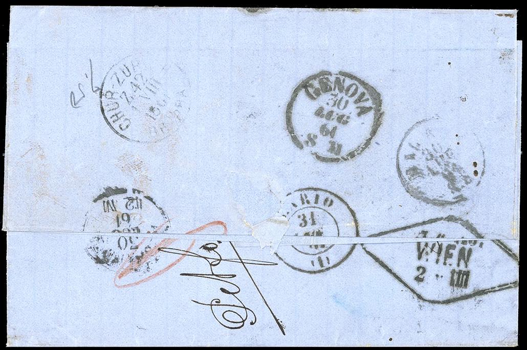 1861 - 40 cent. carminio (21), tre esemplari, lievi difetti di marginatura, su sovracoperta di lettera, di doppio porto, da Livorno 29/7/1861 a Vienna, per la VIA DI SVIZZERA, numerosi bolli di transito al verso, tassata 15 kr. Molto rara e di ottimo aspetto! Ferrario.