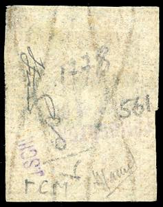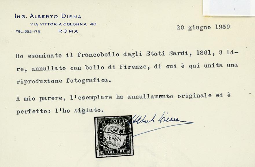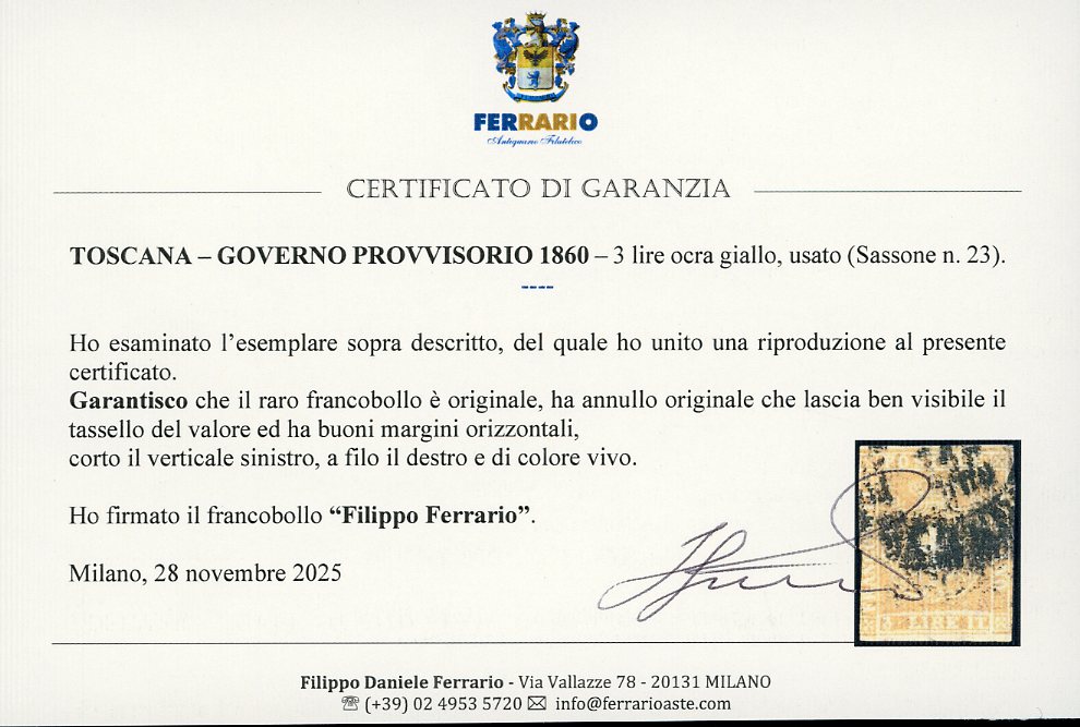 1860 - 3 lire ocra giallo (23), buoni margini orizzontali, corto il verticale sinistro e a filo il destro, usato con annullo che lascia completamente scoperto il tassello del valore. Molto raro. Cert. Ferrario.