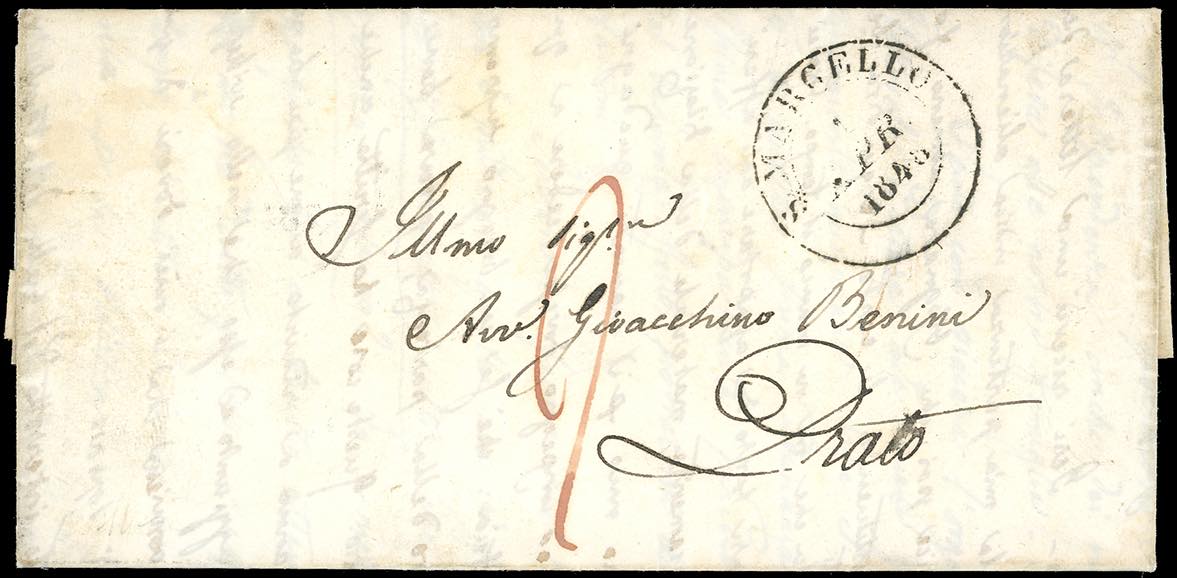 1848 - Lettera completa di testo scritta a Pieve Pelago il 30 e il 31 marzo 1848 da un volontario toscano, impostata a San Marcello 1/4/1848 per Prato, tassata 2 crazie. Interessante testo storico, che fa riferimento all'avanzata delle truppe toscane.