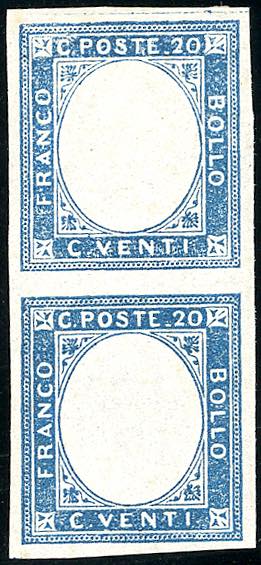 1861 - 20 cent. azzurro, coppia verticale, un esemplare senza effigie (3d), gomma originale, perfetta. Rara e di ottima qualità. ... Leggi tutto
