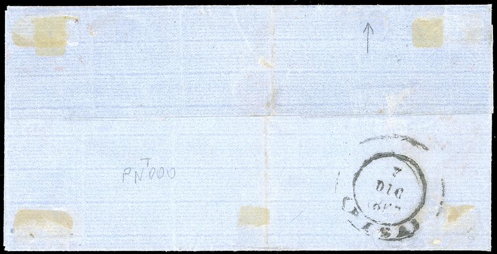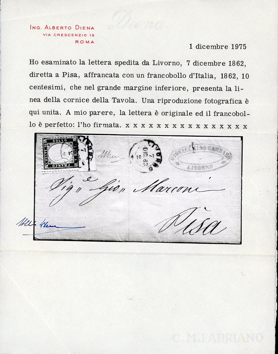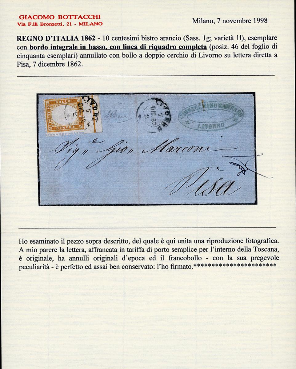 1862 - 10 cent. bistro arancio, angolo di foglio con bordo integrale in basso e linea di riquadro (1g/l), perfetto, su fresca lettera da Livorno 7/12/1863 a Pisa. Rara e di ottima qualità. Cert. A.Diena e Bottacchi.