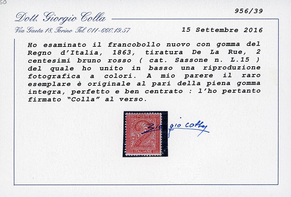 1863 - 2 cent. De La Rue, tiratura di Londra (L15), buona centratura, nuovo, gomma originale integra, perfetto. Cert. Colla (cat.Sassone € 10.000/24.000).