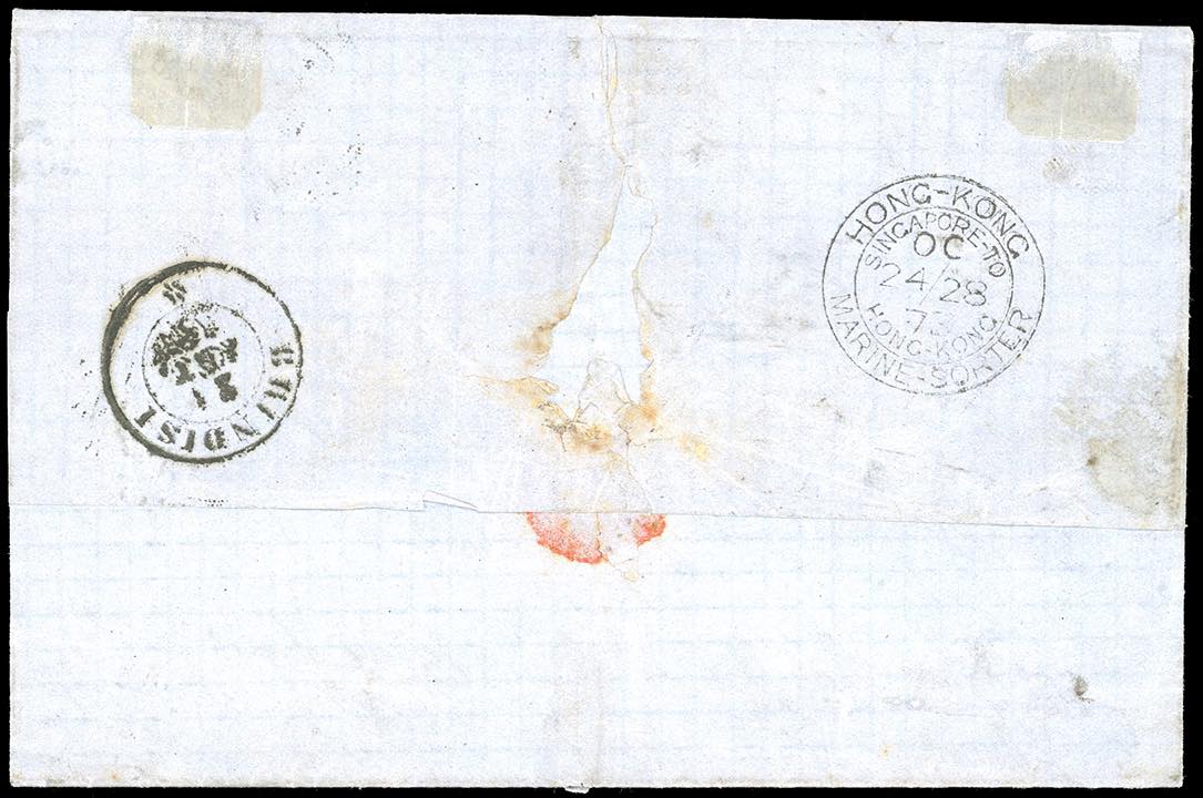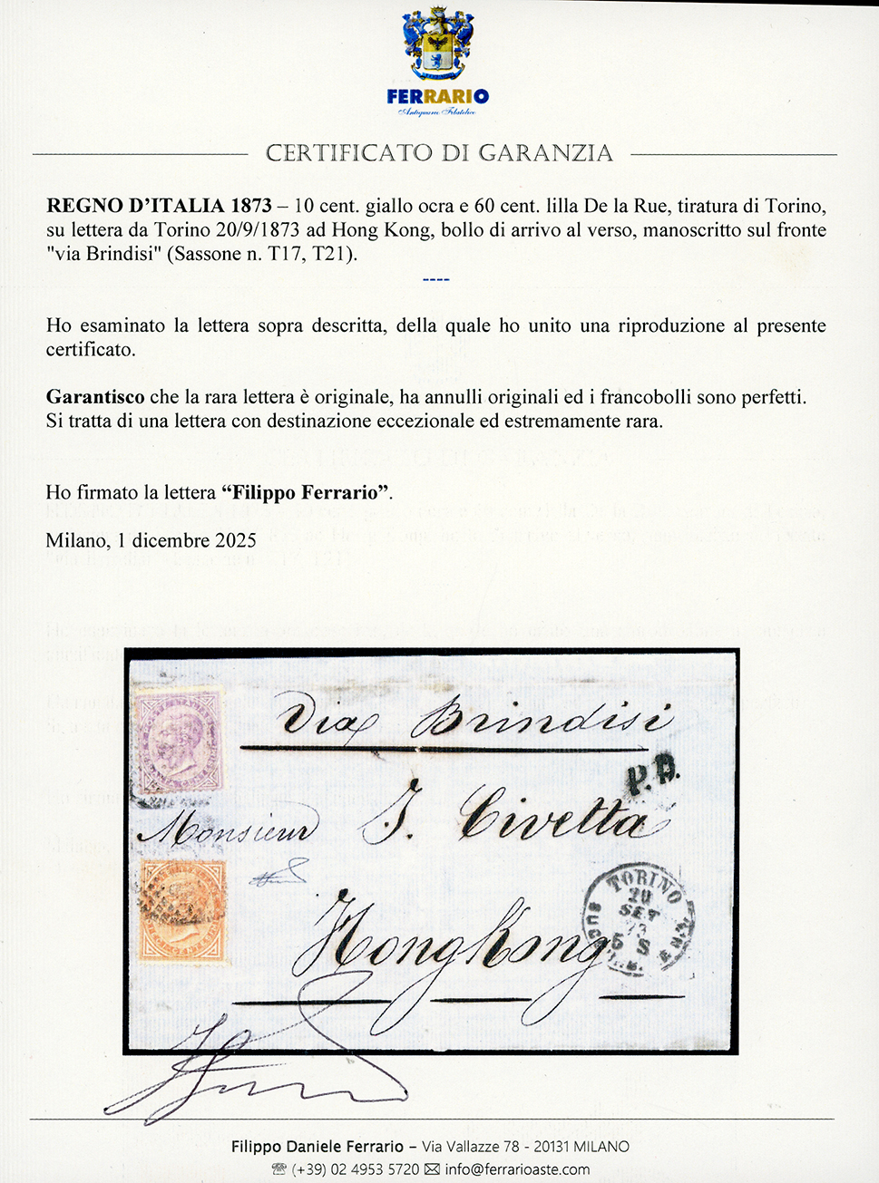 1873 - 10 cent. e 60 cent. De La Rue, tiratura di Torino (T17,T21), perfetti, su lettera da Torino 20/9/1873 ad Hong Kong, bollo di arrivo al verso, manoscritto sul fronte "via Brindisi". Destinazione eccezionale ed estremamente rara, di grande fascino. Cert. Ferrario.