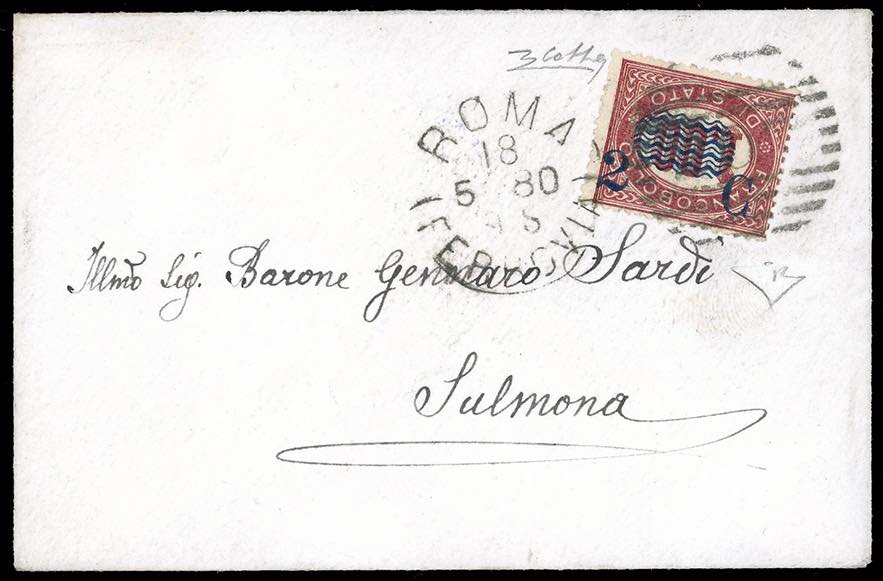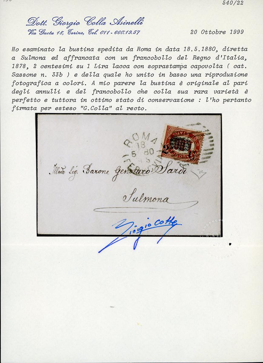 1880 - 2 cent. su 1 lira Servizio soprastampati, soprastampa capovolta (33b), perfetto, su bella bustina da Roma 18/5/1880 a Sulmona. Rara e di ottima qualità. Cert. E.Diena e Colla.