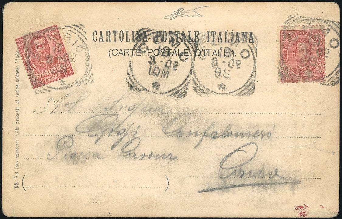 1902 - 10 cent. Umberto I (60), su cartolina da Como 13/8/1902 a Sondrio, riaffrancata con 10 cent. Floreale (71), e rispedita cancellando l'indirizzo a Como. Interessante e rara affrancatura di rispedizione mista "due Re" con valori gemelli. Ferrario.