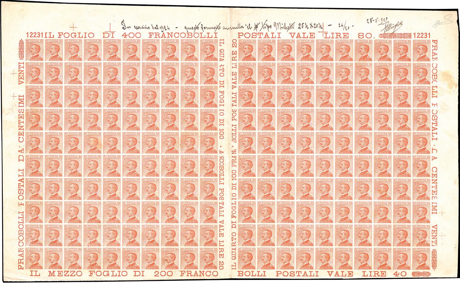 1925 - 20 cent. arancio brunastro, Michetti (183), prova di stampa su carta bianca- verdastra spessa, senza filigrana, senza gomma come sempre. Eccezionale doppio foglio composto da 200 esemplari con interspazio di gruppo al centro e numeri di tavola negli angoli superiori, perfetto. Insieme straordinario ed unico. Di tale prova di macchina finora si conoscevano solo pochi esemplari e nessuno era finora noto recante coppia con interspazio di gruppo al centro. Grande rarità. Cert. Ferrario (i cataloghi CEI e Sassone catalogano prove simili circa 50.000/60.000 €).