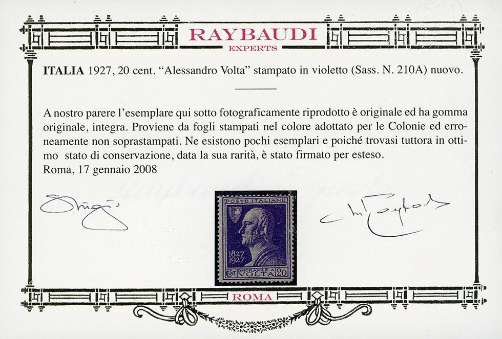 1927 - 20 cent. Volta Violetto, errore di colore (210A), nuovo, gomma originale integra, perfetto, buona centratura, molto fresco. Cert. Oro Raybaudi.