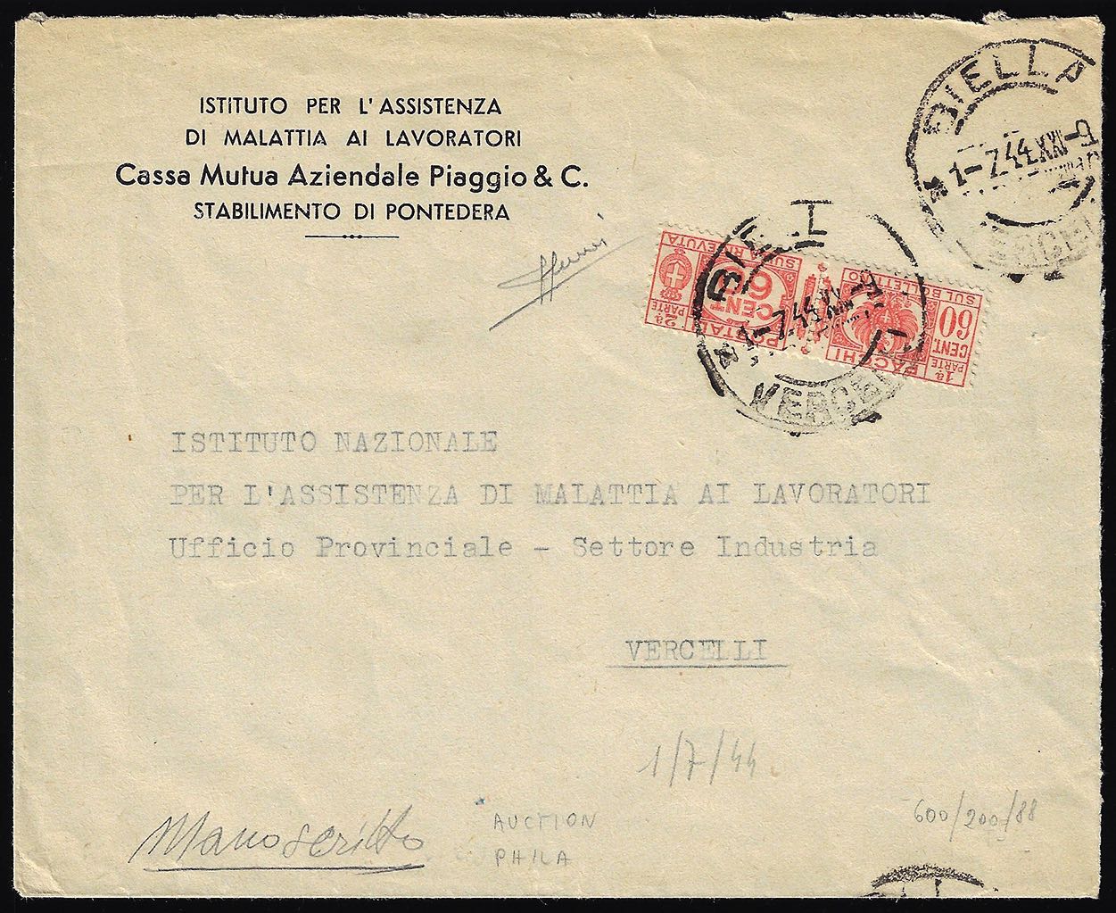 1944 - 60 cent. rosso, fasci al centro (29), perfetto, isolato su busta contenente manoscritti, annullato a Biella 1/7/1944. Raro uso ... Leggi tutto